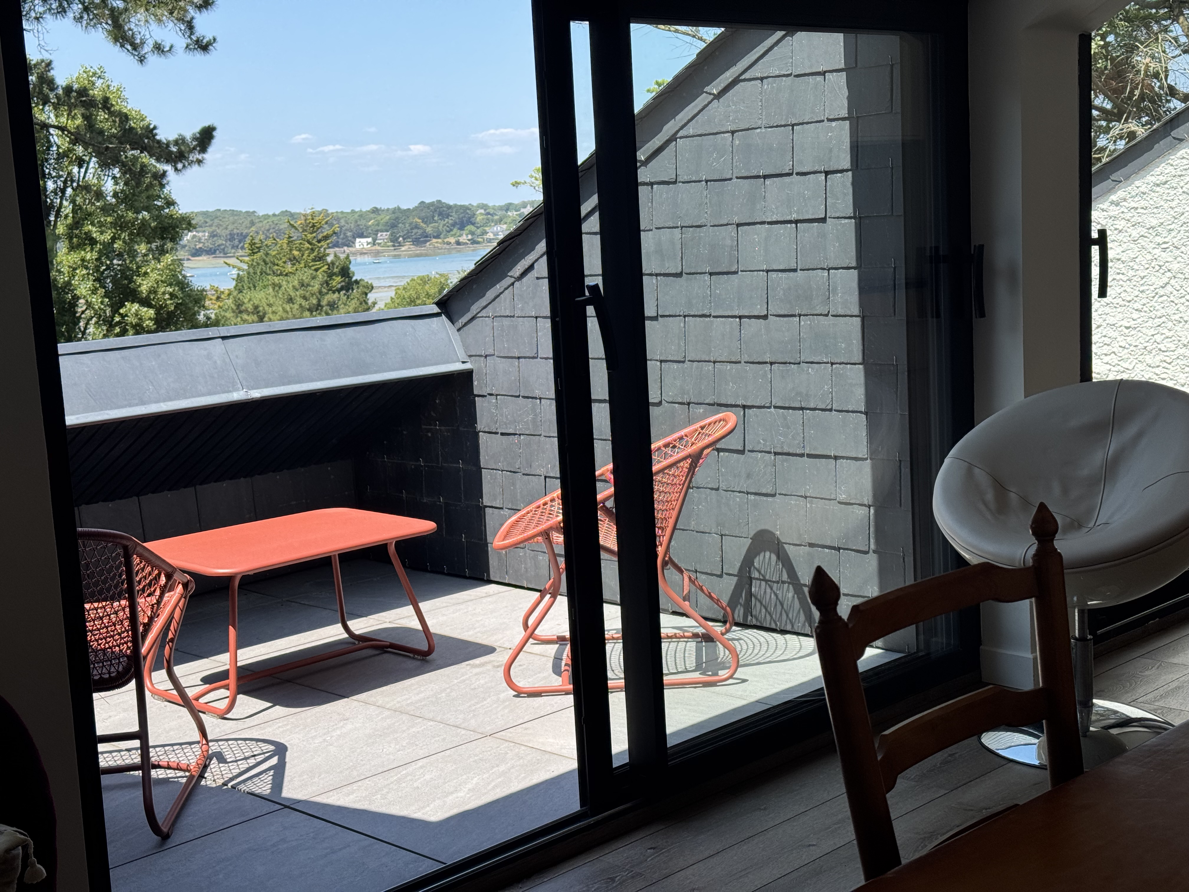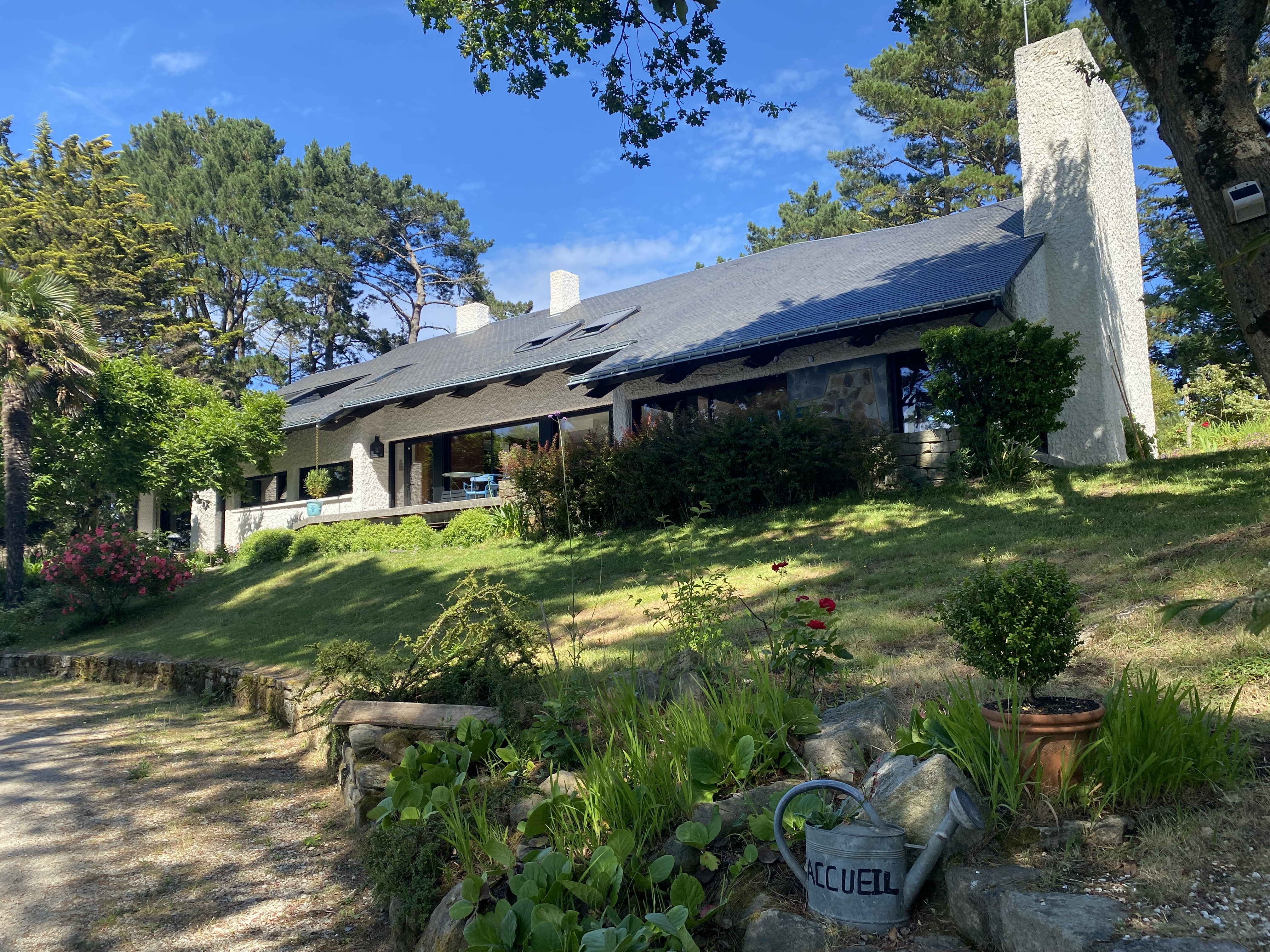 Lors de votre séjour à Mane Braz, maison contemporaine construite en 1968, vous pourrez apprécier la vue sur la rivière à travers les pins qui forment un écrin. Car comme son nom l’indique, elle est juchée sur sa colline qui surplombe la rivière de Crac’h, en amont du célèbre pont de la Trinité sur mer.